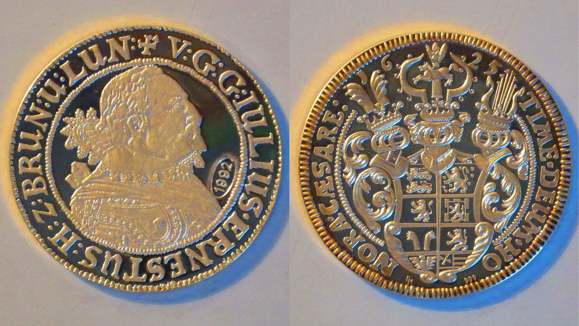 Martin Lüning hat die Nachbildung des Scharnebecker Talers mit der automatischen HDR-Technik seines Fotoapperates aufgenommen. Dadurch erscheint der silberfarbene Taler kontrastreich zweifarbig und die Feinheiten kommen sehr gut zum Vorschein.